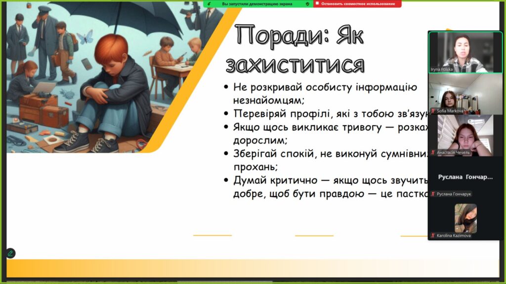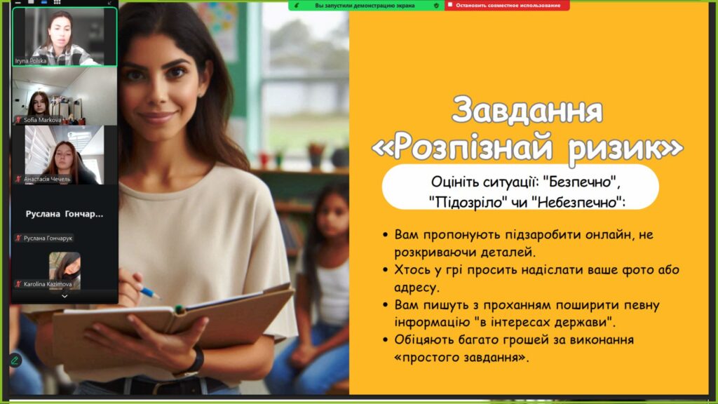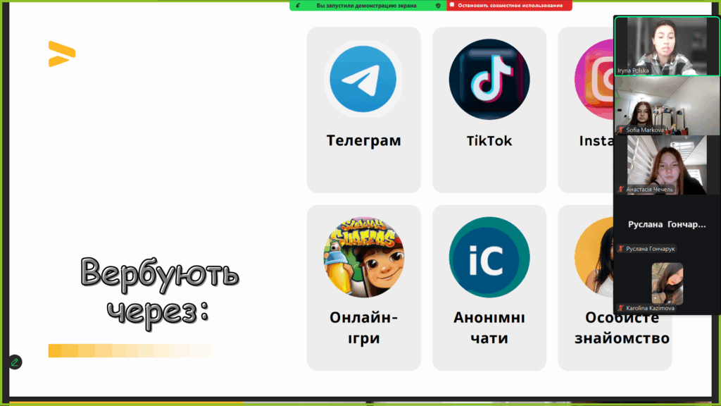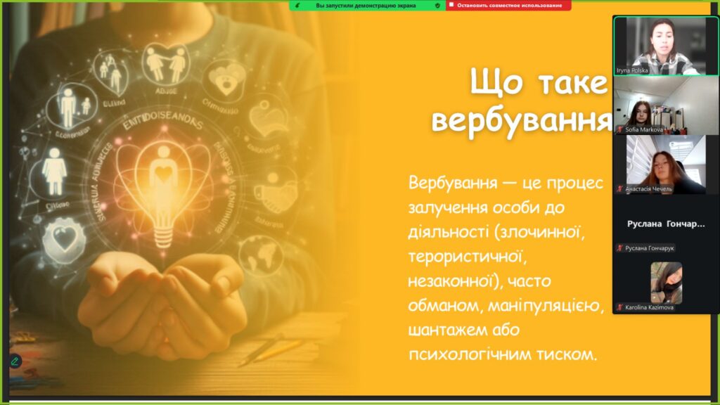 Класний керівник 8-А класу Польська Ірина Олександрівна провела бесіду на тему: «Небезпека вербування в Інтернеті» з метою підвищення обізнаності учнів щодо ризиків онлайн-спілкування, формування навичок безпечної поведінки в Інтернеті, запобігання потраплянню під вплив вербувальників та розвитку критичного мислення під час користування соціальними мережами й онлайн-платформами.