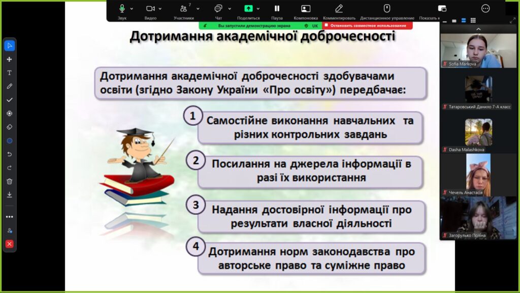 Протягом нього з учнями 1-11 класів було проведено інформаційні хвилинки, під час яких обговорювали важливість чесності, відповідальності та поваги до інтелектуальної власності в освітньому процесі.
